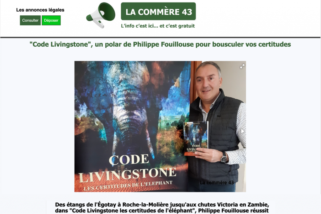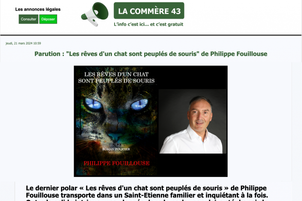 Articles de Presse Retrouvez ici tous les articles de presse consacrés à l’auteur, ses œuvres et l’univers qui l’entoure. Dernières Parutions Voir tous les livres Le Vieil Homme et la Mine Découvrir Les Rêves d'un Chat sont Peuplés de Souris Découvrir Code Livingstone Les Certitudes de l'Éléphant Découvrir